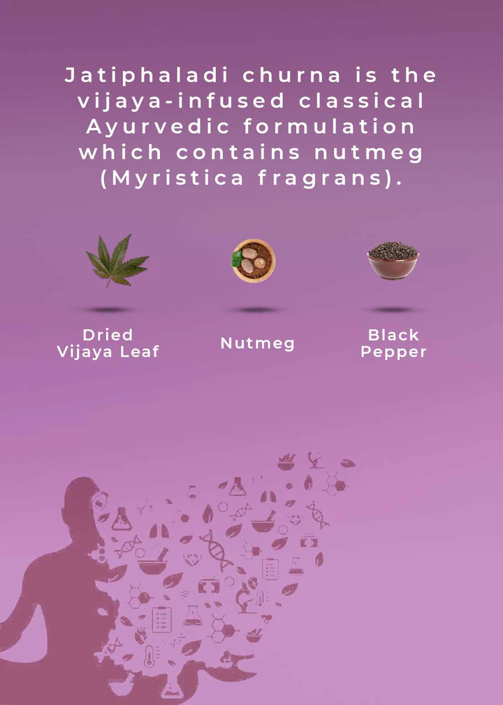 Dried hemp leaves has anti inflammatory properties, helps in relieving pain, treat the problem of insomnia. Jatiphala has anti-inflammatory, expectorant and antiseptic properties. It helps in clearing throat, cough, asthma, throat pain, irritable bowel syndrome.