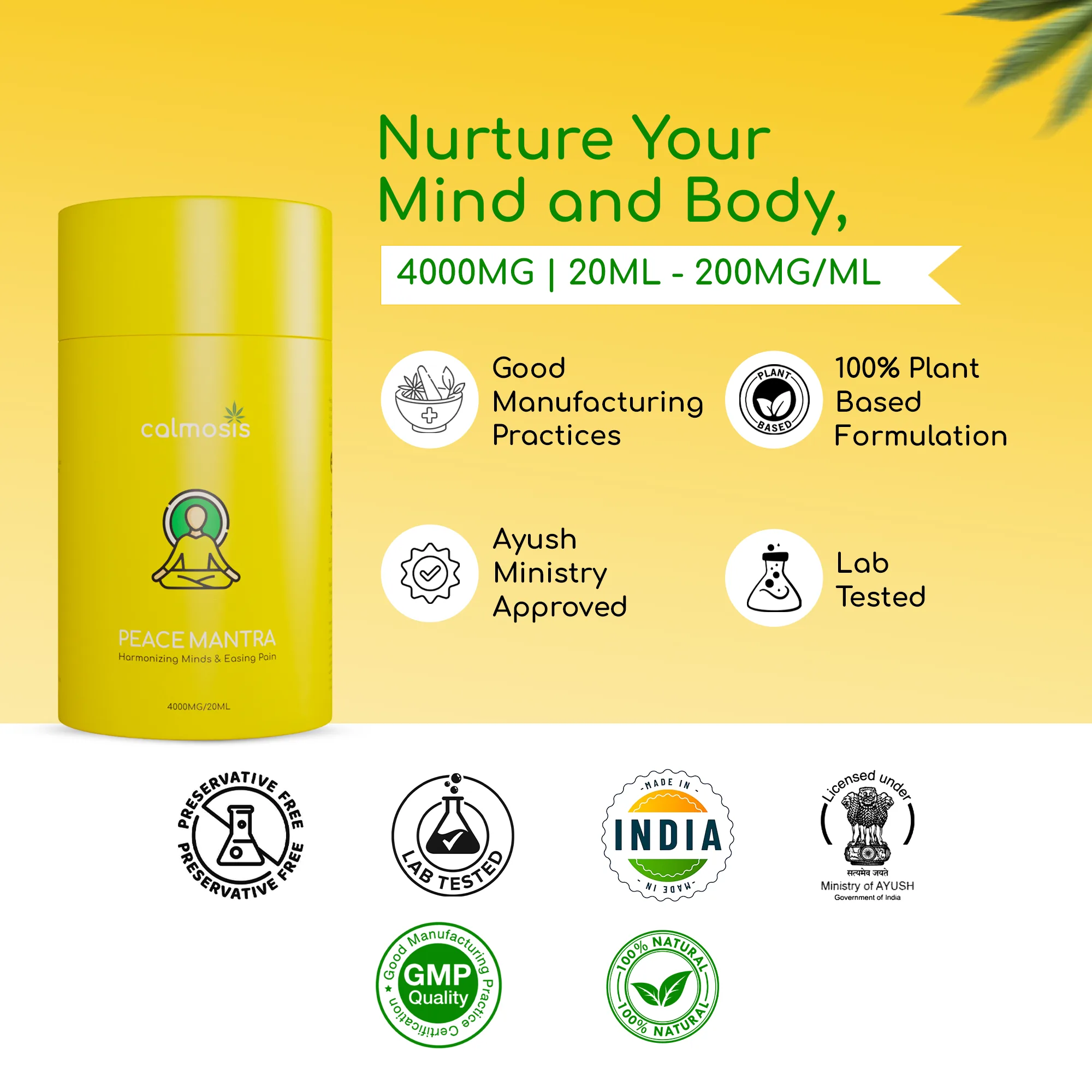 Crafted at the intersection of 5,000-year-old Ayurvedic wisdom and modern full-spectrum cannabis science, Peace Mantra is Calmosis’s flagship multi-herb tincture — India’s most sophisticated daily-use cannabis wellness formula for the modern high-performer.