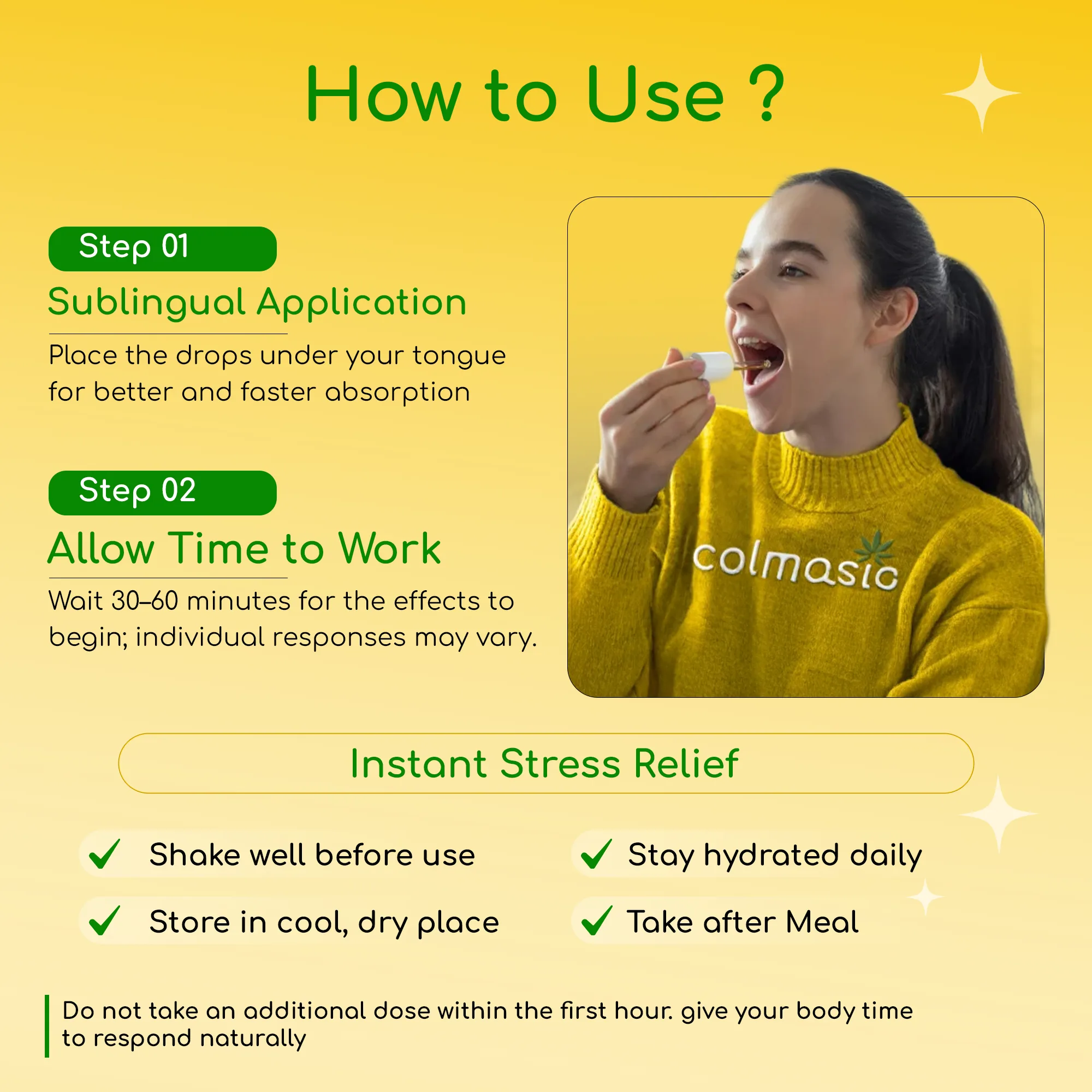 Place 3–5 drops under the tongue (sublingual method). Hold for 30–60 seconds, then swallow. Best taken 30–45 minutes before desired effect window.