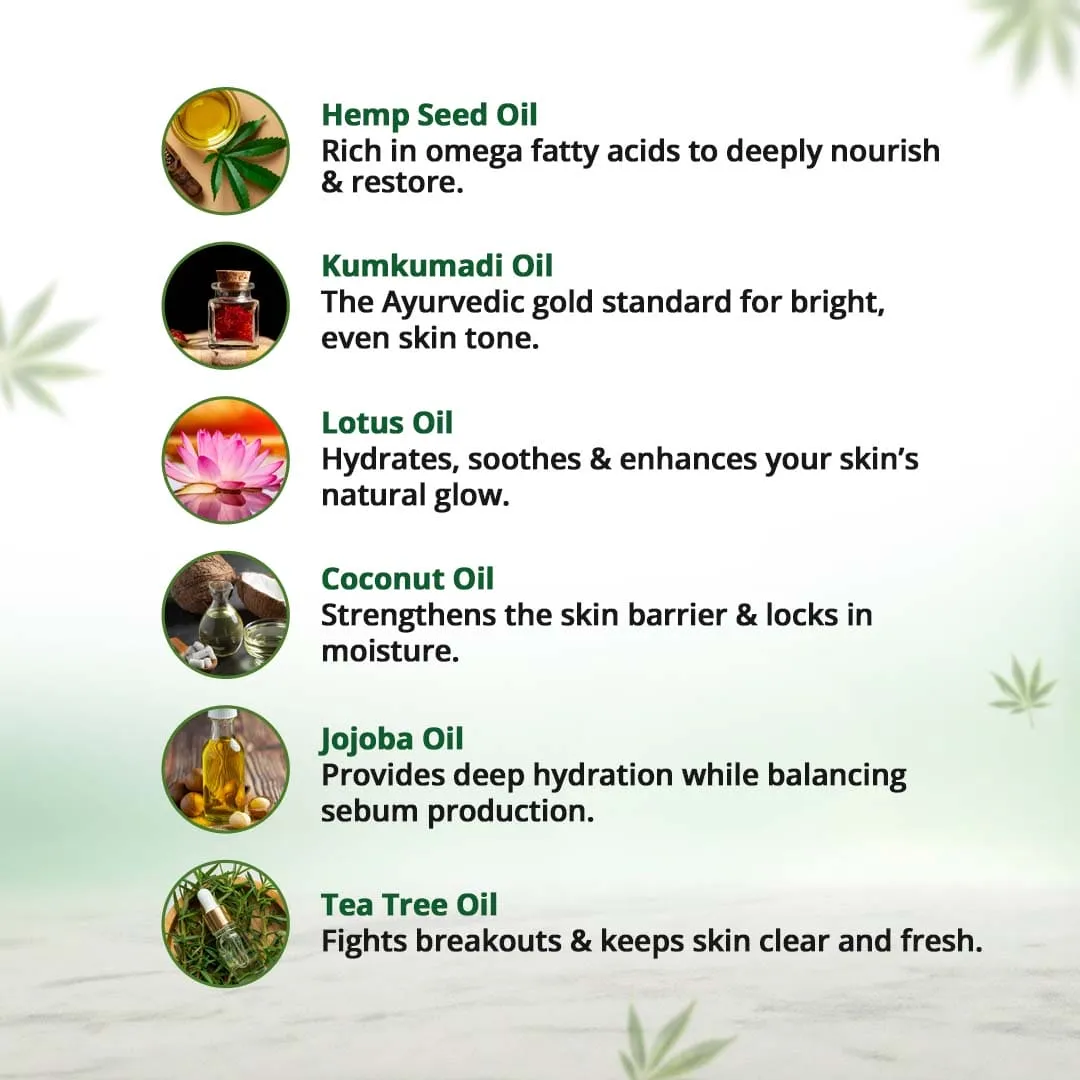 This serum is inspired by Mukha Lepa (herbal facial application) and Kumkumadi Taila (classical saffron oil) traditions, enriched with hemp seed oil. Recognized in modern Ayurveda as a Snigdha-Sheeta (moisturizing-cooling) emollient, hemp seed oil pacifies Pitta (heat/irritation) in Tvak Dhatu (skin tissue). It nourishes Rasa Dhatu (plasma/fluids), restores moisture, and supports repair of fine lines, pigmentation, and dullness. Saffron, Sandalwood, Lotus, and Jojoba enhance Varnya (glow), Kantikara (radiance), and Rakta Shodhaka (blood purifying) benefits, making it a daily Rasayana (rejuvenative) treatment for youthful skin.