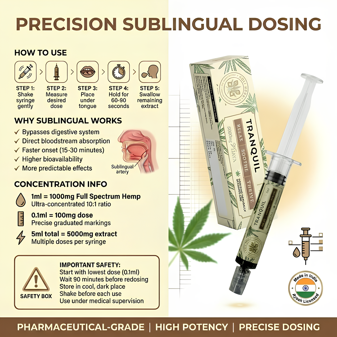 Some nights, you need fast. Tranquil’s sublingual extract delivers CBD dominant Vijaya extract directly into the bloodstream via the sublingual mucosa, bypassing the digestive system for onset in 15–30 minutes. More bioavailable. Faster. Precisely dosed. For sleep support, pain management, and evening calm that doesn’t keep you waiting.