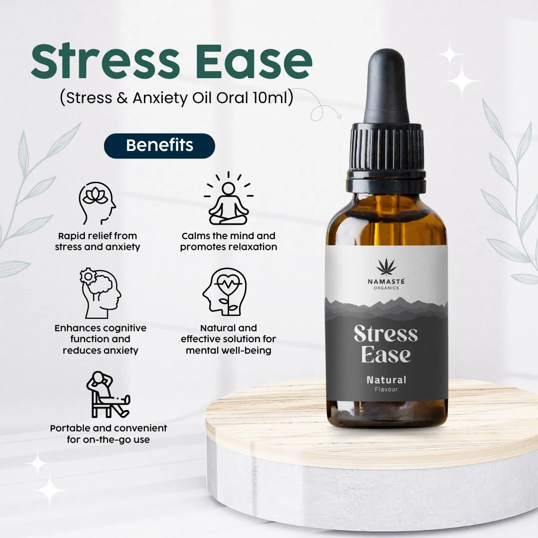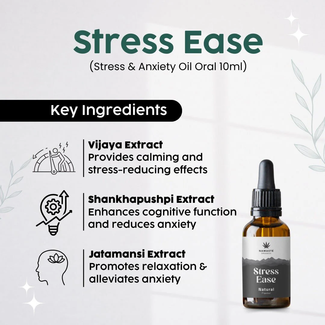 Namaste Organics Stress Ease Oil – Our expertly crafted Ayurvedic formula, Stress Ease, is designed to provide rapid relief from stress and anxiety. Harnessing the power of ancient herbs, this potent oil offers a natural and effective solution to calm your mind.